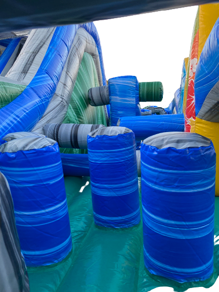 Does your ninja warrior need a little more training? The 40 foot double lane obstacle course would be a great fit for your ninja warrior. With jump throughs, tunnels, obstacles, and double lane slide the 40 foot obstacle course will give your ninja the training they need to become a true ninja warrior. The 40 foot double lane obstacle course features a pool to make a splash in to cool off during their ninja training. If you are planning a ninja party and looking for an obstacle course for rent in Sulphur or looking for an obstacle course for rent in Lake Charles for that special party the 40 foot double lane "Surfs Up" obstacle course would fit your needs.